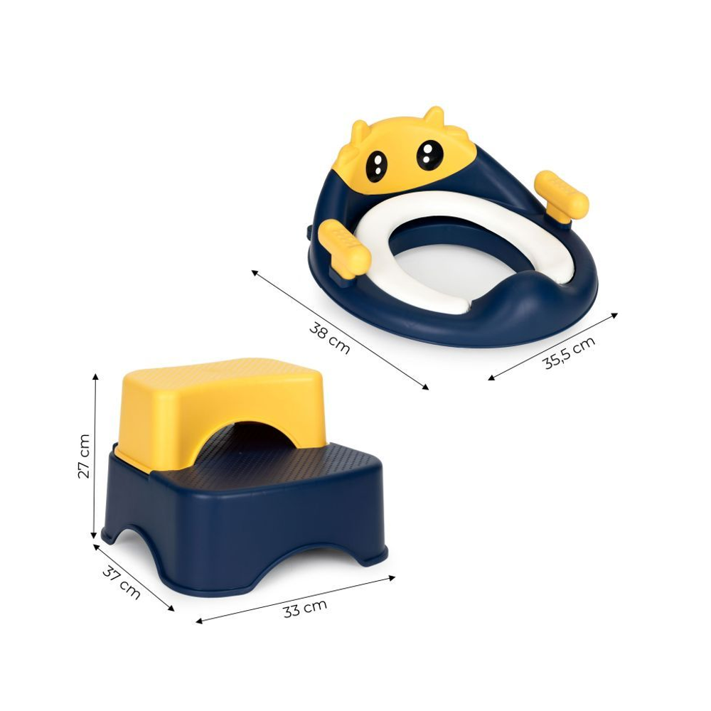 Galimos spalvos – mėlyna ir rožinė. Dangtis puikiai tiks mokantis naudotis tualetu. Rinkinys skirtas vaikams nuo 9 mėnesių amžiaus. Prie dangčio dar pridedame laiptelius, kurie padeda vaikui lengviau pasiekti tualetą. Patogus „pagalvės“ užvalkalas ir rankenos užtikrina jūsų vaiko komfortą naudojimo metu. Universalus dydis leidžia naudoti su visų tipų tualetais. Matmenys:36×35,5x74cm.