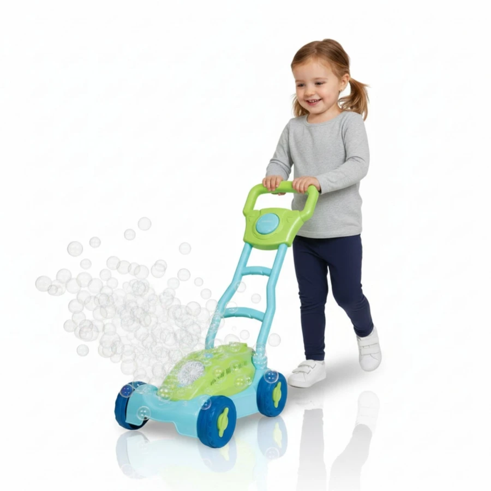 Rekomenduojamas amžius: nuo 3 metų. Vaikiška vejapjovė su integruotu burbulų aparatu linksmoms pramogoms sode. Komplekte yra 160 ml burbulų tirpalo, kad būtų galima iš karto žaisti. Vėjapjovė su LED šviesos efektu ir cypiančiu signalu pagaminta iš patvaraus plastiko. Maitinimo baterijos (4×1,5V AA nepridedamos. Vienu mygtuko paspaudimu mažas ventiliatorius įrenginio priekyje sukuria sūkurinę vaivorykštinių burbulų srovę, kuri šoka ore. Matmenys 26,5 x 20,5 x 48cm. Kilmės šalis: Vokietija