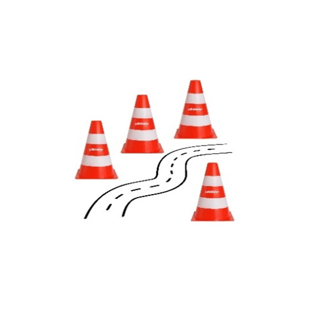 Rekomenduojamas amžius: nuo 3 metų. Keturių eismo kūgių rinkinys pagamintas iš tvirto plastiko. Oranžinės/baltos spalvos, matmenys: 13cm pločio ir 17cm aukščio su skylutėmis tvirtinimui žemėje. Universalus panaudojimas: trasoms, slalomui, eismo mokymui, ženklinimui sporte ir šunų dresūrai. Juos galima sumauti vieną ant kito, kad sutaupytumėte vietos laikymui. Galimi rinkiniai po 12vnt ir 20vnt. Kilmės šalis: Vokietija